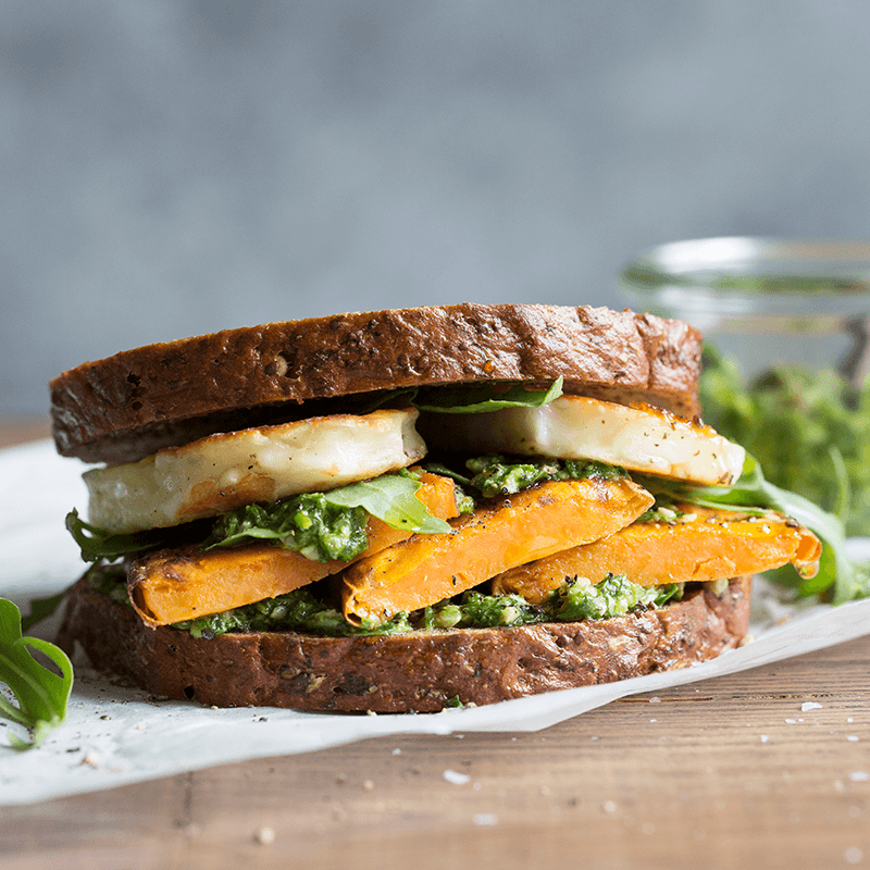 Smør rucolapesto på en skive brød og læg derefter søde kartofler, rucolablade, pesto og halloumiost på. Afslut med en skive brød på toppen.