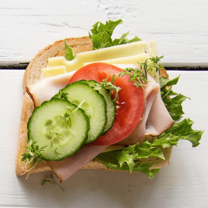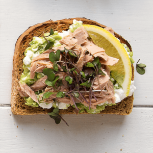 Læg skagenblandingen på en skive brød og top med fiskerogn, nogle hele pillede rejer, en skive citron samt dild.