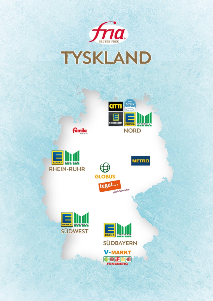 Die Karte zeigt Dir, bei welchen Handelskunden Du Fria bereits findest. Z.B. kann jeder Edeka-Markt der unten markierten Edeka-Regionen bereits Fria über sein Lager für seinen Edeka-Markt bestellen. Sprich gerne die Marktleiter in Deinem Markt vor Ort an, damit wir zukünftig auch in Deiner Nähe erhältlich sind! Online kannst Du unsere Fria-Produkte u.a. über Amazon oder www.mytime.de bequem und tiefgekühlt nach Hause liefern lassen.