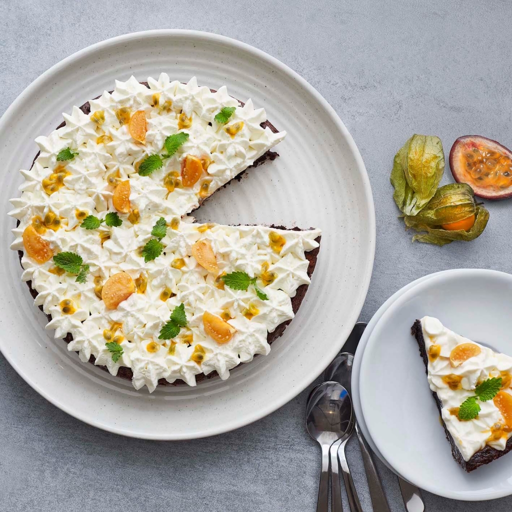 Ota mukakakku pakastimesta sulamaan. Valmista juustokakkukuorrutus vatkaamalla tuorejuustoa ja kermaa sähkövatkaimella kulhossa, kunnes siitä tulee paksua ja kermaista. (Halutessasi sekoita joukkoon raastettu sitruunan kuori) Siivilöi sitten tomusokeri kulhoon ja vaivaa se varovasti lastalla tasaiseksi taikinaksi. Levitä kuorrute mutakakun päälle tai pursota, jos haluat saada hienomman lopputuloksen. Koristele ananaskirsikkalohkoilla, passionhedelmällä ja sitruunamelissalla.