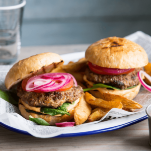 - 120 g (2 x 60 g) 100 % kotimaista naudanlihasekoitusta, jossa on entrecôten, ulkofileen reunaosan ja rintapalan seos, n. 35 % rasvapitoisuudella