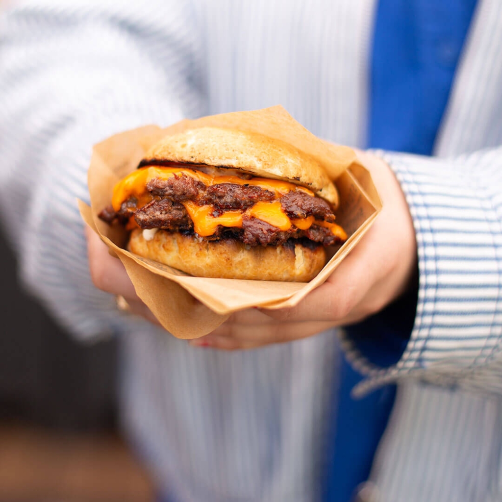 Aloita laittamalla tryffelimajoneesia sämpylän pohjapuolelle. Lisää sitten kaksinkertainen pihvi eli 2 x 60 g juustopihviä. Lisää päälle jäähdytettyä hopeasipulia ja paahdettua sipulia. Viimeistele levittämällä hampurilaiskastiketta sämpylän yläosaan. Kokoa hampurilainen ja nauti!