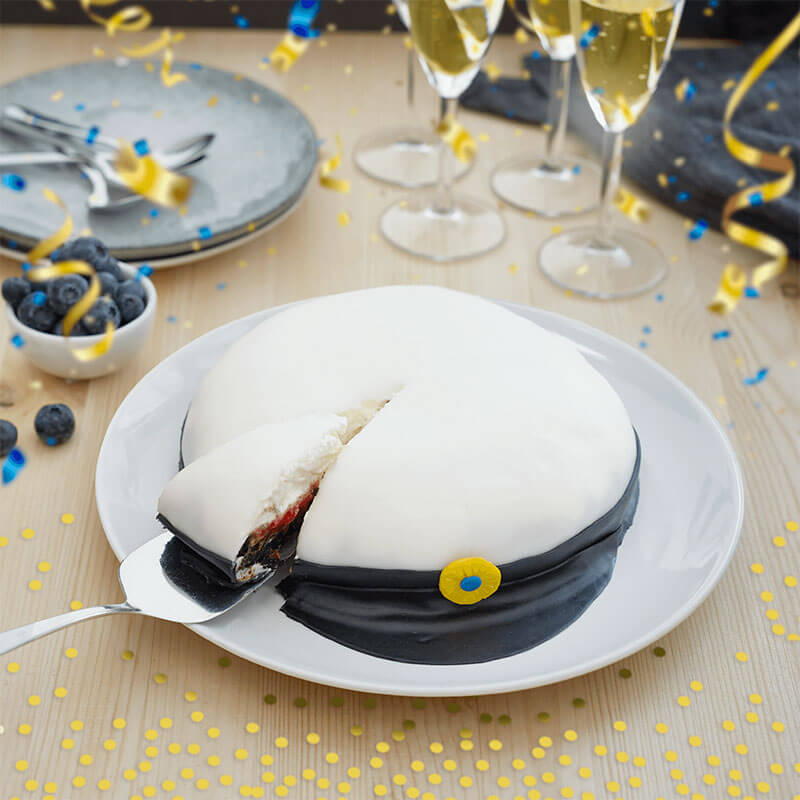 Aloita asettamalla mutakakku lautaselle. Sulata mustikat ja valuta ylimääräinen neste pois tarvittaessa. Lisää vaniljasokeri ja levitä seos mutakakun päälle. Vatkaa kerma ja levitä paksu kerros marjojen päälle. Anna kerman olla hieman korkeampi yhdeltä puolelta, jotta saat “lakkimaisen” muodon. Peitä kakku valkoisella marsipaanikuorrutteella ja leikkaa ylimääräinen pois kakun reunoilta.
