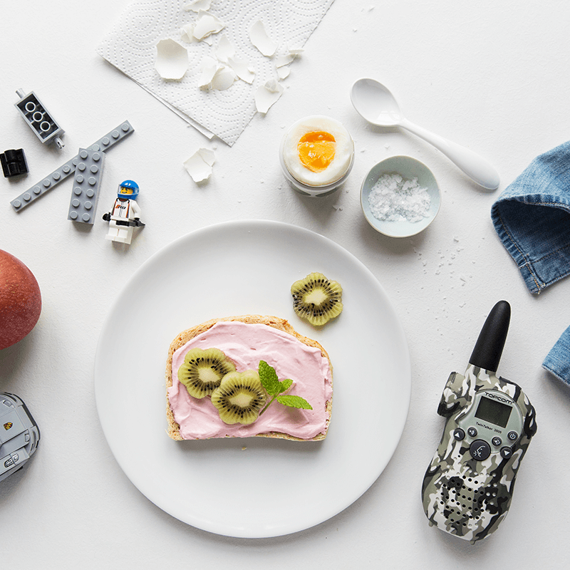 Sekoita ensin tuorejuusto ja vadelmat kunnes seos on vaaleanpunaista. Levitä seos leivälle ja koristele sen jälkeen muutamalla kiiviviipaleella.