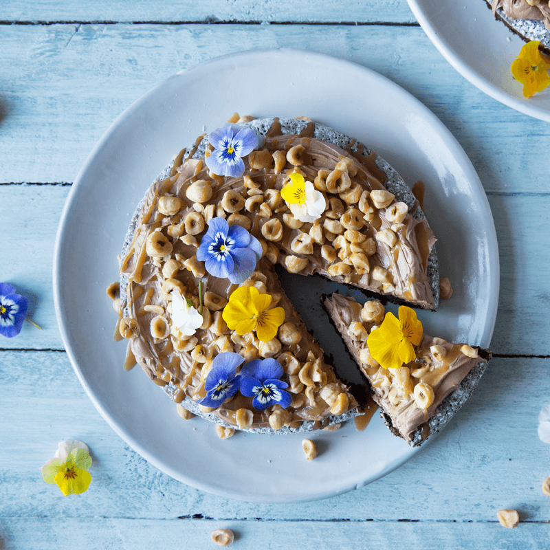 - Ingredienser 2 Fria sjokoladekaker 100 g ristede hasselnøtter, grovt hakket Stemorsblomster eller andre spiselige blomster