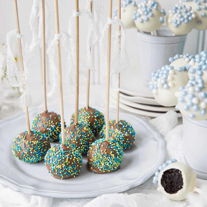 Dypp deretter kulene i sjokoladen og snurr av overflødig sjokolade. Pynt med strøssel før sjokoladen stivner. Sett cakepopsene på en tallerken, eller trykk dem ned i en isoporplate slik at de kan stivne.