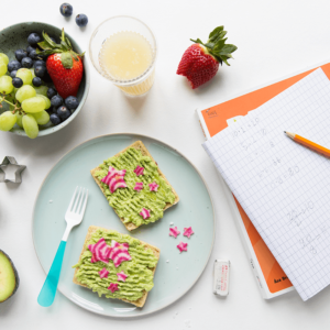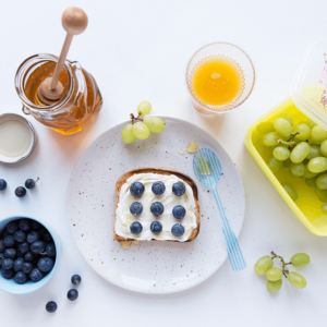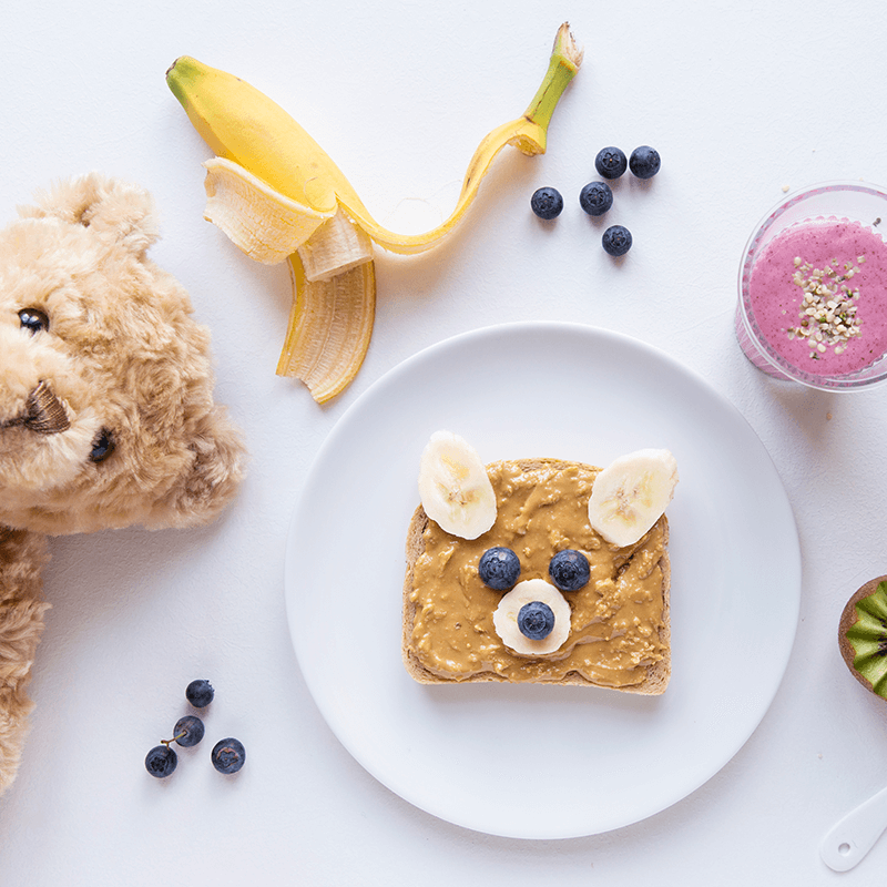 Das Brot im Toaster toasten, mit Erdnussbutter bestreichen und mit ein paar Bananenscheiben und zwei oder drei Blaubeeren belegen.